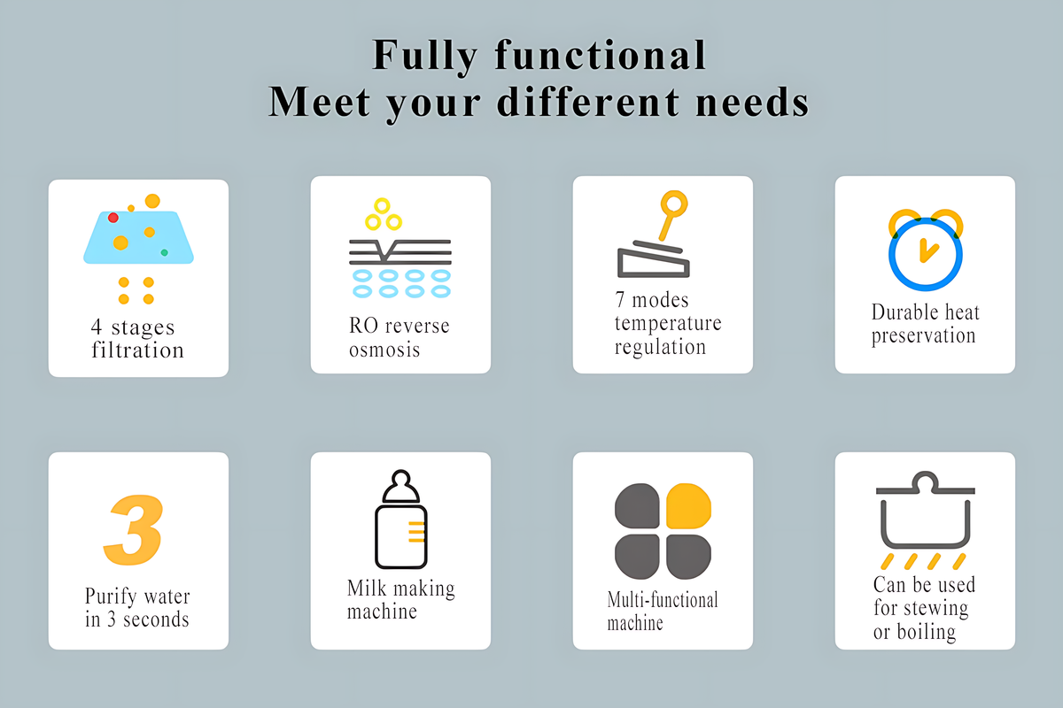- Instant Heating Function – Provides water from room temperature up to 212°F (100°C) for tea, coffee, baby formula, or cooking.